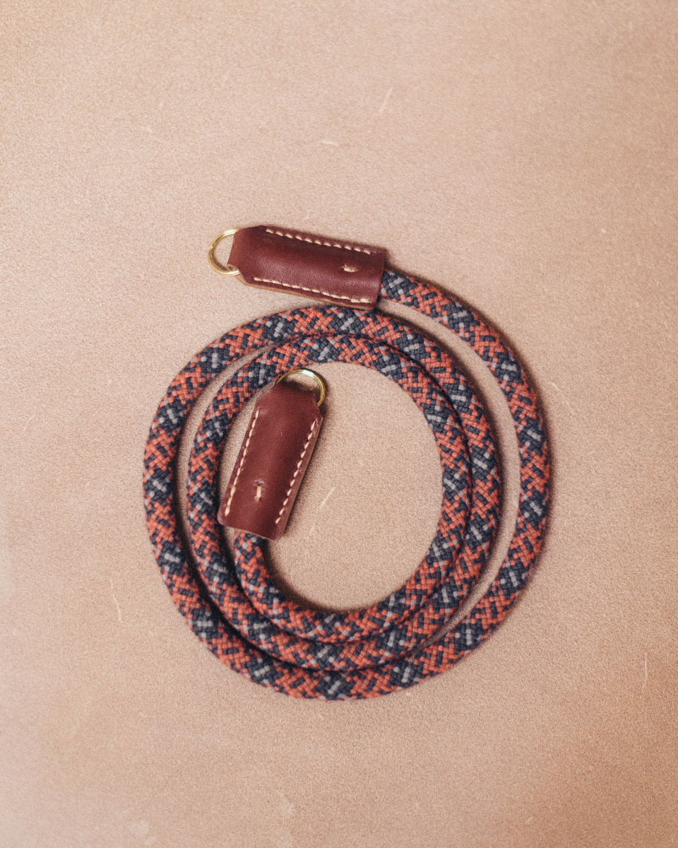 Our camera straps are made from reclaimed climbing rope and oak bark tanned leather, hand stitched and made to last. Each colour is limited in quantity.